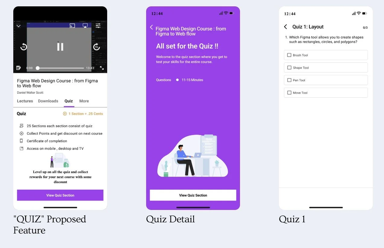 Project Overview: This project describes a redesign of Udemy’s learning experience by introducing a quiz-based rewards feature that motivates learners to complete course sections. The feature allows users to earn points through quizzes, which can be redeemed as discounts on future courses, helping increase engagement, course completion, and learning motivation.